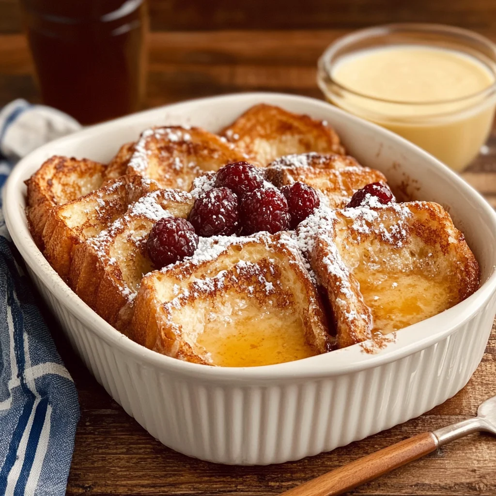 This casserole pairs beautifully with fresh fruits, whipped cream, or a drizzle of maple syrup. You can also serve it with breakfast meats like bacon or sausage for a complete meal.